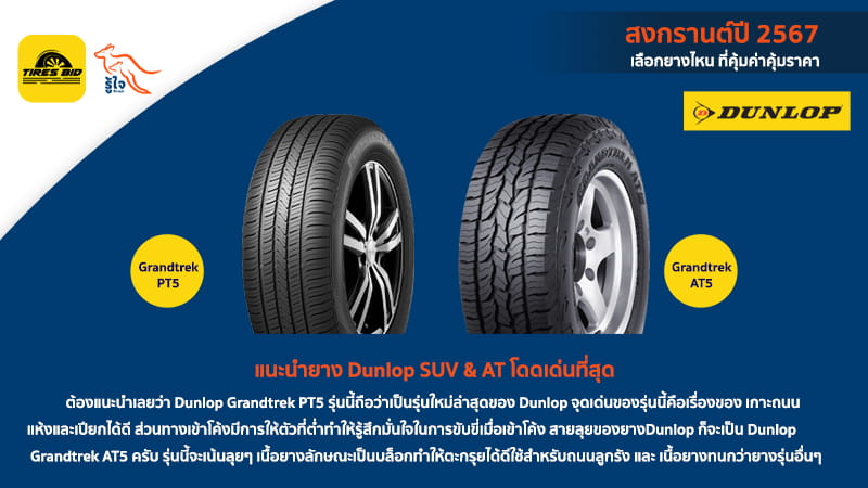 วนต่อมายางกระบะและกลุ่มรถอเนกประสงค์ (SUV) นั้น ณตอนนี้ต้องแนะนำเลยว่า Dunlop Grandtrek PT5 รุ่นนี้ถือว่าเป็นรุ่นใหม่ล่าสุดของ Dunlop ครับ ซึ่งจุดเด่นของรุ่นนี้คือเรื่องของสมรรถนะการขับขี่ที่ดีมากๆเกาะถนนแห้งและเปียกได้ดีครับ ส่วนทางเข้าโค้งมีการให้ตัวที่ต่ำทำให้รู้สึกมั่นใจในการขับขี่เมื่อเข้าโค้งมาขึ้นครับผม เพราะฉะนั้นคุ้มสุดๆครับ และสำหรับสายลุยของยางDunlop ก็จะเป็น Dunlop Grandtrek AT5 ครับ รุ่นนี้จะเน้นลุยๆ เนื้อยางลักษณะเป็นบล็อกทำให้ตะกรุยได้ดีใช้สำหรับถนนลูกรัง และ เนื้อยางทนกว่ายางรุ่นอื่นๆทำให้ลดปัญหาการเนื้อยางฉีกขาด และ ยางก็จะทนมากๆครับ ก็จะเป็น 3 รุ่นหลักๆที่อยากแนะนำครับผมสำหรับ Dunlop